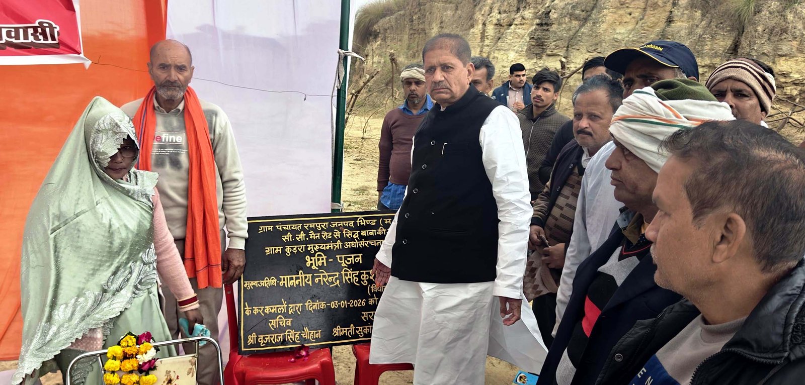 भिण्ड विधायक नरेन्द्र सिंह कुशवाह अपनी विधानसभा क्षेत्र के ग्राम पंचायत रमपुरा में 20 लाख लागत की से बनने वाली सीसी सड़क का भूमिपूजन किया। जो कि मुख्य मार्ग से कुंडरा होते हुए सिद्धबाबा स्थान तक गुणवत्ता के साथ निर्माण किया जाएगा।