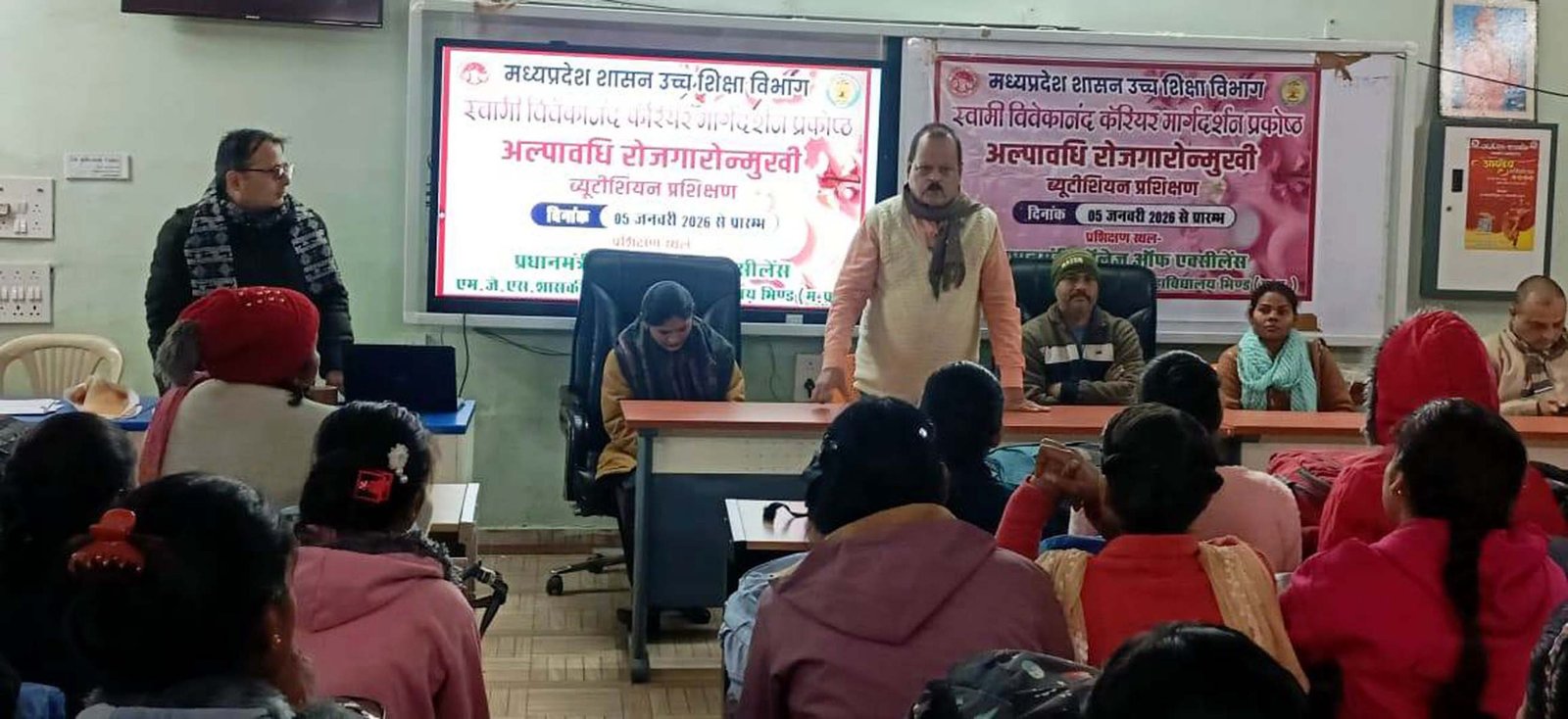 भिण्ड, 05 जनवरी। प्रधानमंत्री कॉलेज ऑफ एक्सीलेंस शा. एमजेएस महाविद्यालय भिण्ड में स्वामी विवेकानंद कैरियर मार्गदर्शन प्रकोष्ठ के अंतर्गत मप्र और शिक्षा विभाग के दिशा निर्देश में अल्प अवधि रोजगार प्रशिक्षण कोर्स के अंतर्गत महाविद्यालय छात्रों के प्रशिक्षण हेतु ब्यूटीशियन कोर्स का प्रशिक्षण का शुभारंभ सोमवार को किया गया।