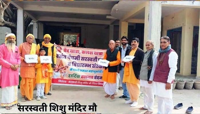 भिण्ड, 24 जनवरी। बसंत पंचमी के पावन अवसर पर सरस्वती शिशु मन्दिर मौ में विद्यारंभ संस्कार का गरिमामय आयोजन किया गया। इस अवसर पर 3 से 5 वर्ष आयु वर्ग के नन्हे शिशुओं का वैदिक विधि विधान एवं मंत्रोच्चार के साथ विद्यारंभ संस्कार संपन्न कराया गया। विद्यारंभ संस्कार के लिए पंजीकृत बच्चों ने अपनी स्लेट पर ऊँ अंकित कर विद्या अध्ययन का श्रीगणेश किया।