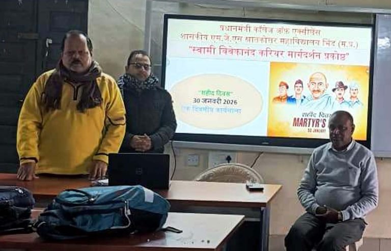 भिण्ड, 30 जनवरी। प्रधानमंत्री कॉलेज ऑफ एक्सीलेंस शा. एमजेएस महाविद्यालय भिण्ड में शहीद दिवस के अवसर पर प्राचार्य डॉ. आरए शर्मा के मार्गदर्शन और स्वामी विवेकानंद कैरियर मार्गदर्शन प्रकोष्ठ के तत्वावधान में एक दिवसीय कार्यशाला का आयोजन किया गया।