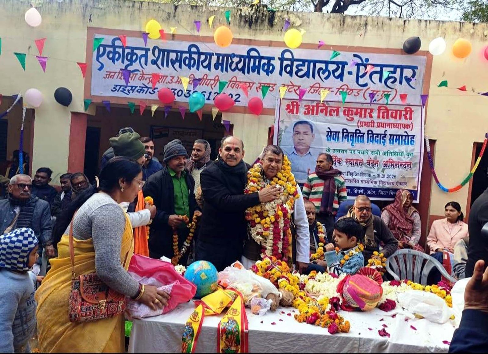भिण्ड, 31 जनवरी। एकीकृत शासकीय माध्यमिक विद्यालय ऐतहार में प्रभारी प्राचार्य अनिल कुमार तिवारी के सेवानिवृत्त होने पर विदाई एवं सम्मान समारोह का आयोजन किया गया। कार्यक्रम में शिक्षक रामविलास शुक्ला, अनीता शर्मा, दयानंद शर्मा सहित विद्यालय के शिक्षक-शिक्षिकाओं ने तिवारी को पुष्पमालाएं पहनाकर सम्मानित किया।