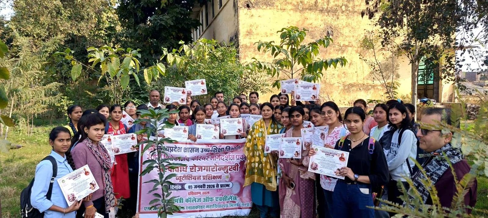 भिण्ड, 11 फरवरी। प्रधानमंत्री कॉलेज ऑफ एक्सीलेंस शा. एमजेएस महाविद्यालय भिण्ड में स्वामी विवेकानंद कैरियर मार्गदर्शन प्रकोष्ठ के तत्वावधान में संचालित अल्पावधि रोजगारोन्मुखी ब्यूटीशियन प्रशिक्षण कार्यक्रम का समापन प्राचार्य डॉ. आरए शर्मा के मार्गदर्शन में किया गया। सर्वप्रथम सभी शिक्षकों और प्राचार्य ने मां सरस्वती के चरणों में पुष्प अर्पित कर कार्यक्रम का शुभारंभ किया। तत्पश्चात प्रशिक्षिका गायत्री नरवरिया ने विद्यार्थियों को संपूर्ण सत्र के दौरान होने वाली सभी गतिविधियों के साथ उनके विचार और मार्गदर्शन प्रदान किया। प्रशिक्षिका शिवानी ने छात्राओं को प्रशिक्षण में सीखे गए सभी कलाओं को घर पर और अन्य साथियों के साथ दोहराने की सलाह दी। उन्होंने कहा कि यह प्रशिक्षण केवल स्वयं के लिए नहीं है, बल्कि स्वरोजगार प्राप्त करने के लिए भी है।