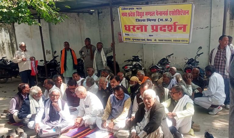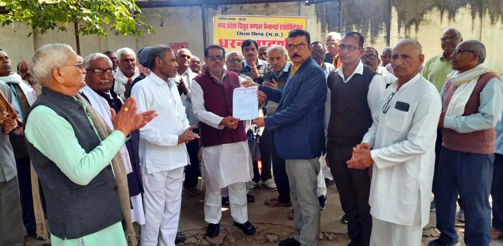 भिण्ड, 11 फरवरी। विद्युत विभाग से सेवानिवृत्त कर्मचारियों को केन्द्र सरकार के कर्मचारियों के समान डीए दिए जाने एवं पिछले एक वर्ष 2025 का 3 तीन डीए का तत्काल भुगतान किए जाने, विद्युत कर्मचारियों के सेवानिवृत्त के बाद पेंशन की गारंटी सुनिश्चित करने की मांग को लेकर राज्यव्यापी आह्वान पर बुधवार को अधीक्षण यंत्री विद्युत विभाग कार्यालय पर मप्र विद्युत मंडल पेंशनर्स एसोसिएशन भिण्ड ने मुन्ना लाल शर्मा की अध्यक्षता में धरना देकर प्रदेश के मुख्यमंत्री के नाम अधीक्षण यंत्री को ज्ञापन सौंपा।