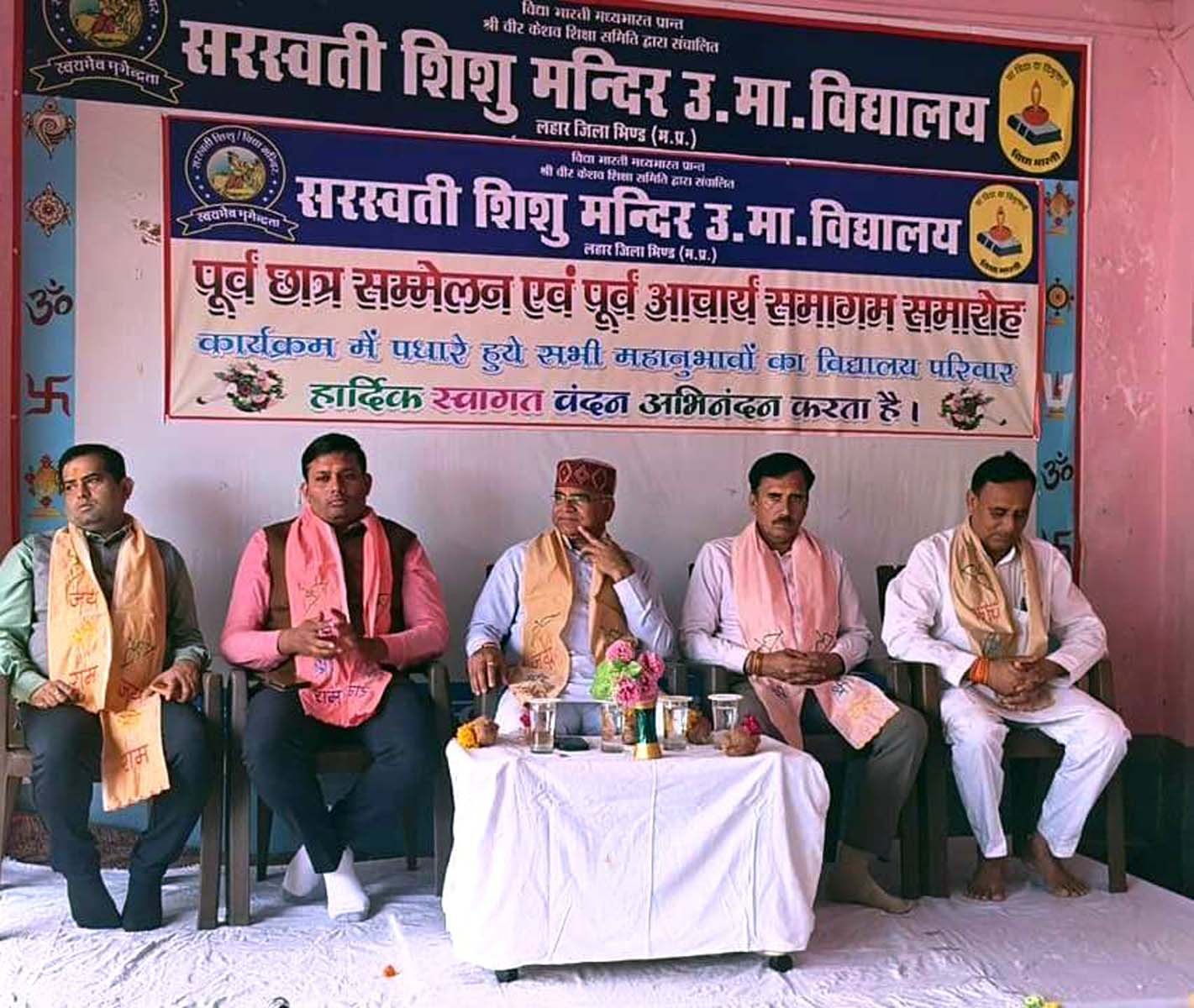 भिण्ड, 21 मार्च। सरस्वती शिशु मन्दिर लहार में नगर के पूर्व छात्रों एवं आचार्य परिवार का सम्मेलन गरिमामय वातावरण में संपन्न हुआ। इस मौके पर बतौर मुख्य अतिथि प्रांत संगठन मंत्री निखिलेश महेश्वरी एवं एसडीएम लहार विजय सिंह यादव प्रमुख रूप से मौजूद रहे। कार्यक्रम का शुभारंभ मां सरस्वती के छाया चित्र पर दीप प्रज्ज्वलित कर किया गया। जिसमें पूर्व छात्रों ने अपने विद्यालय जीवन के अनुभव साझा किए, जिससे वातावरण भावनात्मक एवं प्रेरणादायी बन गया। पूर्व छात्रों ने अपनी पिटाई से लेकर पढ़ाई तक का अनुभव साझा किया। अतिथियों का स्वागत पूर्व छात्र एवं सह सचिव मोनू उपाध्याय एवं शिक्षक आकाश दीक्षित, शिवमंगल दुबे, आशीष त्रिपाठी ने श्रीफल एवं पट्टिका पहनाकर किया।