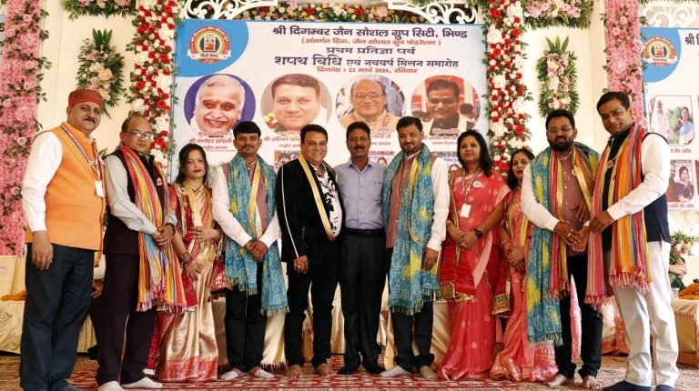 भिण्ड, 24 मार्च। दिगंबर जैन सोशल ग्रुप सिटी भिण्ड द्वारा शहर के अटेर रोड स्थित महावीर मांगलिक भवन में प्रथम प्रतिज्ञा पर्व 2026, शपथ विधि एवं नव वर्ष मिलन समारोह का भव्य आयोजन किया गया। गरिमापूर्ण माहौल में आयोजित इस कार्यक्रम में संस्था के 81 दंपति सदस्यों ने समाज सेवा और संगठन की निष्ठा की शपथ ली। कार्यक्रम में मुख्य रूप से राष्ट्रीय अध्यक्ष मनोहर झांझरी, राष्ट्रीय कोषाध्यक्ष अश्वनी कासलीवाल, चंबल रीजन अध्यक्ष अनुपम चौधरी एवं सचिव आशीष जैन उपस्थित रहे। उज्जैन से पधारे फेडरेशन के संयुक्त महासचिव एवं शपथ विधि अधिकारी जीवंधर जैन ने विधिवत रूप से कार्यकारिणी को पद और गोपनीयता की शपथ दिलाई।