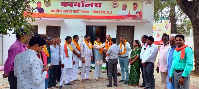 भिण्ड, 27 मार्च। जिला भाजपा कार्यालय पर राठौर समाज के जिलाध्यक्ष दिनेश राठौर के नेतृत्व मे समाज बंधुओं का प्रतिनिधि मण्डल भाजपा कार्यालय पहुंचकर जिलाध्यक्ष देवेन्द्र सिंह नरवरिया का स्वागत कर आभार व्यक्त किया और कहा कि आपने हमारे समाज से युवा मिलनसार एडवोकेट सुभाष राठौर को जिला मे मंत्री बनाकर समाज को जो सम्मान दिया है उसके लिए हम राठौर समाज द्वारा आपका एवं भाजपा के शीर्ष नेतृव का आभार व्यक्त करते हैं।