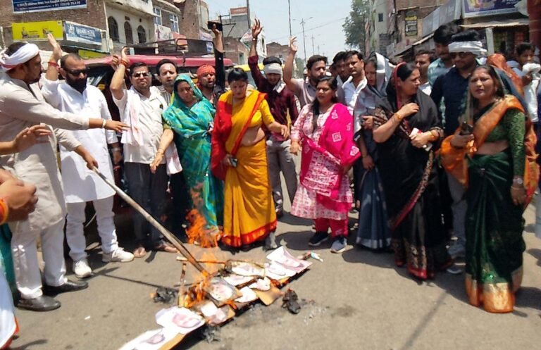 भिण्ड, 22 अप्रैल। प्रधानमंत्री नरेन्द्र मोदी द्वारा लोकसभा के विशेष सत्र में महिलाओं के लिए नारी शक्ति वंदन अधिनियम के बिल को पारित न होने देना कांग्रेस, समाजवादी पार्टी, टीएमसी एवं राष्ट्र विरोधी राजनीतिक दलों ने महिलाओं की बिल पारित न होने देने को लेकर परेड चौराहे पर सामाजिक संगठनों द्वारा पदयात्रा के मध्य से प्रकट करते हुए सामाजिक संगठन के कार्यकर्ता एवं महिलाओं ने बुधवार को परेड चौराहे पर पुतला दहन किया।
