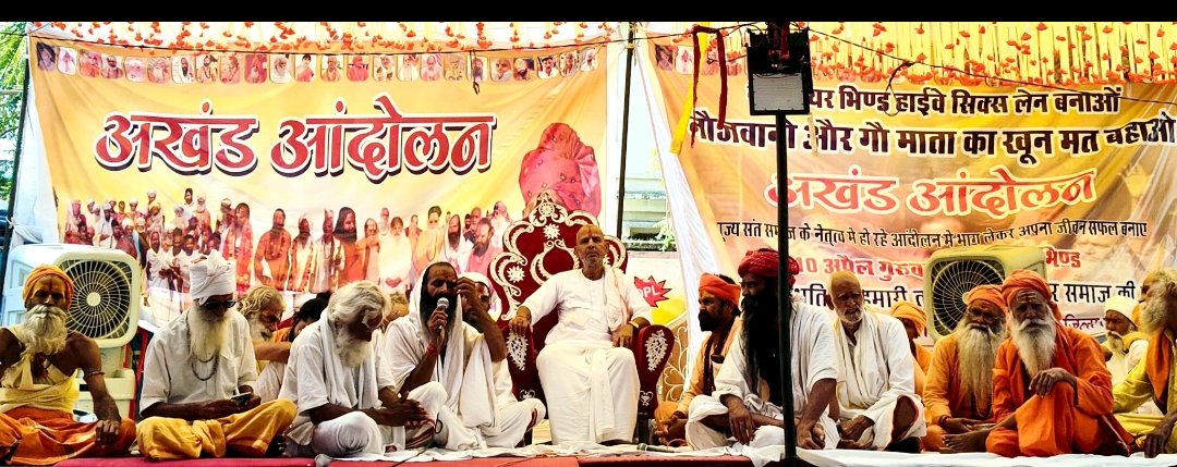 भिण्ड ब्यूरो – ग्वालियर भिंड हाईवे सिक्स लेन और गौ अभ्यारण की मांग को लेकर अखंड आंदोलन खंडा रोड पर पर बैठे संत समाज को आज आठ दिन हो गए अनशन को आज चौथा दिन है चौथे दिन दोपहर तपती दोपहरी में खुले आसमान के नीचे हवन किया आरती पूजा ईश्वर आराधना कर सरकार की सद्बुद्धि के लिए प्रार्थना की , अखिल भारतीय संत समिति जिला अध्यक्ष कालीदास महाराज जी ने बताया कि शनि धाम के महंत श्री श्री 1008 पूज्य संत शिवरामदास जी महाराज त्यागी बाबा ने अखंड आंदोलन का समर्थन दिया और कहा अब संत पीछे नहीं हटेंगे यह धर्म का कार्य अगर सरकार ने नहीं सुना तो जल्दी ही दिल्ली कुछ कर सकते है चंबल संभाग के हजारों संत ।
