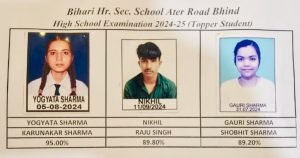 श्री बांके बिहारी शिक्षा प्रसार समिति द्वारा संचालित बिहारी बाल मंदिर की कक्षा 10वीं की छात्रा योग्यता शर्मा ने 95.00 प्रतिशत अंक, निखिल ने 89.80 प्रतिशत, व गौरी शर्मा नें 89.20 प्रतिशत अंक प्राप्त कर बिहारी बाल मंदिर स्कूल का नाम रोशन किया। छात्रों की इस उपलब्धि पर संस्था के संचालक राजेश शर्मा, अध्यक्ष रामनरेश तिवारी, प्रशासनिक अधिकारी बीएस पाल, प्राचार्य डॉ. प्रभात पाठक, प्राचार्य पीके शर्मा, रामभरत पाठक, आलोक शर्मा, पुनीत शर्मा, पवन भदौरिया, संतोष श्रीवास्तव, रिचा मुदगल, लवली यादव, पवन प्रकाश चतुर्वेदी सहित सभी शिक्षकों ने सफल छात्र-छात्राओं व उनके माता-पिता को बधाई एवं शुभकामनाएं दी हैं।